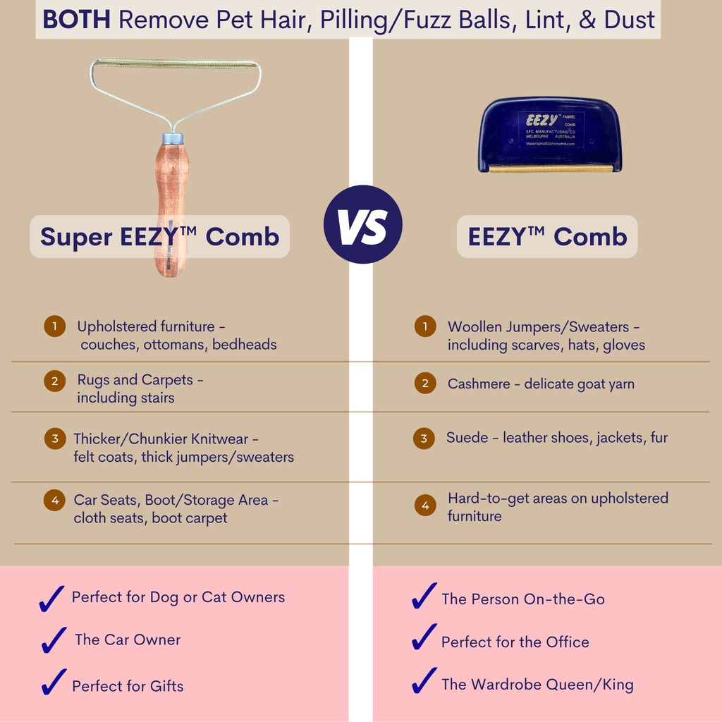 - The SUPER EEZY™ Combs work their best magic on plush fabric like velvet, or natural fibres like Cotton, Wool, and Linens. - For all other fabrics, especially with a lot of Polyester or Acrylic, or extra textured, loosely woven, or knotty fabric, test first on an inconspicuous area first to test if it's suitable for your fabric typeTo Use: Comb firmly in one direction